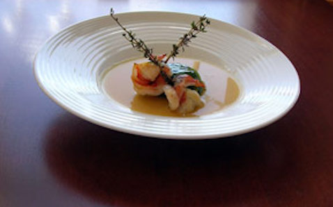 - Chemiser les moules avec les épinards et remplir avec la farce de fruits de mer. Garnir avec une brochette de crevettes enfilée sur une branche de thym poêlée à la minute.