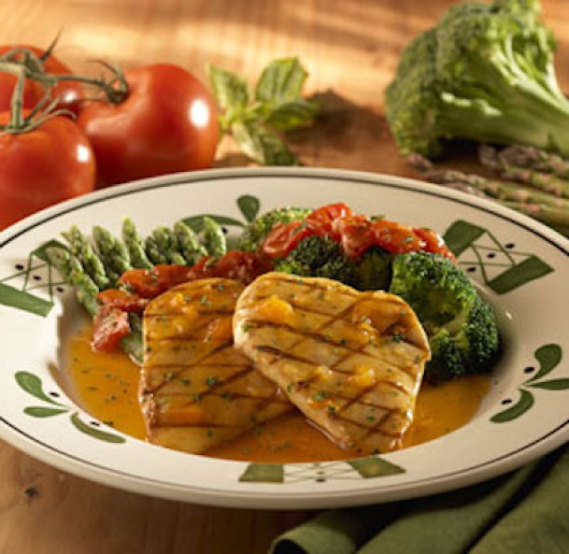 - Griller les blancs de poulet jusqu'à l'obtention d'une température interne de 74°C [165°F]. Disposer les blancs de poulet sur une assiette de service à côté des fleurons de brocoli bien chauds et des asperges bien chaudes.