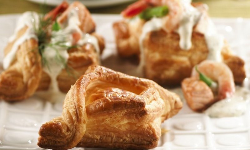 - Laisser mijoter doucement la sauce pendant 5 min, incorporer les fruits de mer et les champignons, saler et poivrer au goût, et laisser mijoter quelques minutes encore, puis servir sur les vol-au-vent préalablement chauffés au four.