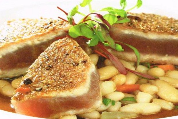 - Chauffer l'huile d'olive dans une poêle épaisse à feu vif jusqu'à ce qu'elle soit chaude, mais qu'elle ne fume pas. Saisir le thon des deux côtés en commençant par celui qui est recouvert des épices. Retirer du feu et saler légèrement. Mettre le thon poêlé dans un bolet y verser le mélange de jus de citron.